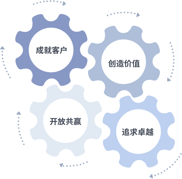 成就客戶是一切決策的出發(fā)點,創(chuàng)造價值是衡量所有工作的標(biāo)準(zhǔn),追求卓越是我們做事做人的態(tài)度,開放共贏是我們的格局也是最終的結(jié)果。價值觀的齒輪環(huán)環(huán)相扣,推動著組織里的每個人不斷向前。