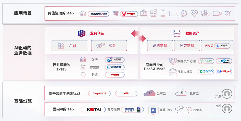 在基礎設施層面,基于商業或開源的云原生就緒開發工具與技術組件(PaaS)和面向AI的底層公共基礎設施資源(IaaS),將共同支撐企業完成數字化轉型